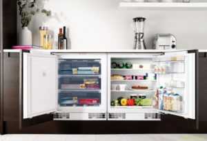 Холодильник, вмещающийся под навесным шкафом, значительно сэкономит площадь кухни