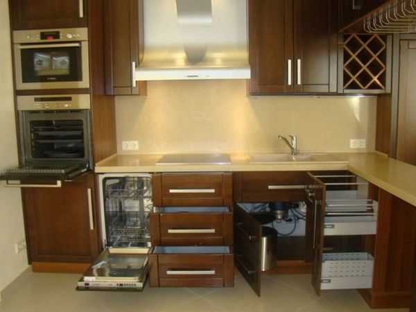 Следующий важный момент — выбор техники. Эти предметы занимают всегда много места. Особенно это касается таких основных агрегатов, как духовка, посудомоечная машинка, микроволновая печь и т. п. Но и в данном случае найдется выход для обустройства маленьких кухонь .