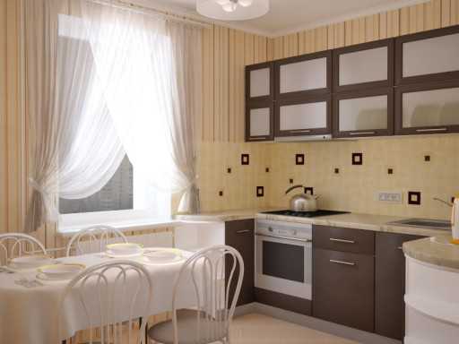 Окна должны быть оформлены легкими воздушными занавесками. Тяжелые портьеры, обилие деталей, слишком сложные драпировки и ламбрекены в очень маленькой кухне выглядят нелепо и сужают пространство. Дизайн штор должен быть по максимуму простым. Хороши классические и римские шторы.