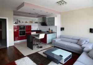 Получив разрешение у домоуправления в правовых органах, возможно выполнить дизайн кухни, совмещённой с гостиной – в итоге получится большое помещение, разделённое на две функциональные зоны.