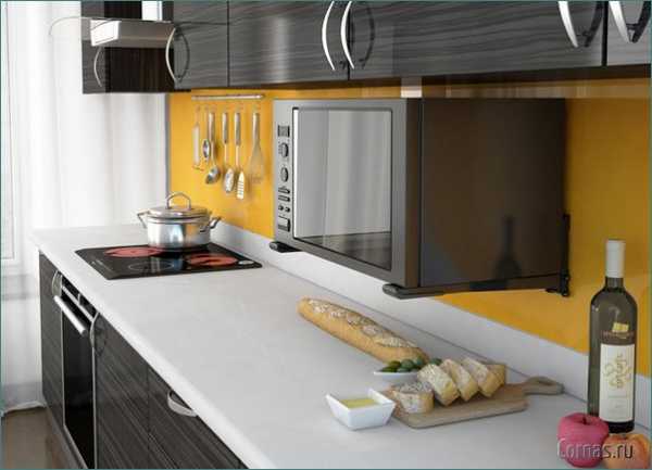 Так существенно сэкономить пространство можно при помощи кронштейнов или релингов под микроволновку. Нижние шкафы лучше не использовать, а заменить их выдвижными ящиками, которые гораздо более удобные для хранения запасов и кухонного инвентаря.