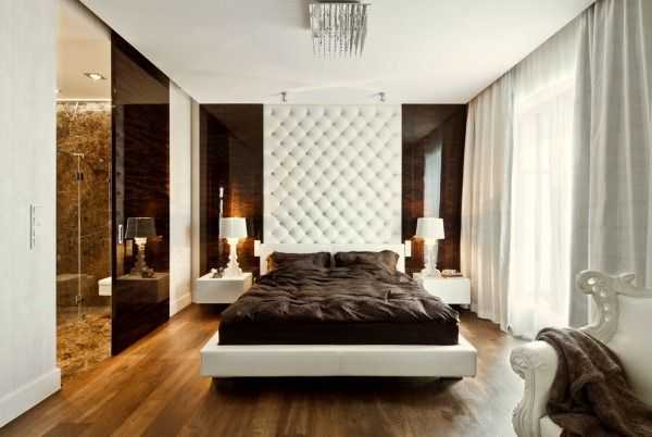Красивые интерьеры квартир в современном стиле, фотоА вот пример современной спальни. Обратите внимание на сочетание оттенков: шоколадный цвет не делает комнату мрачной. Такому эффекту способствуют белоснежные вставки по всему периметру, а также легкие ткани, пропускающие солнечный цвет.