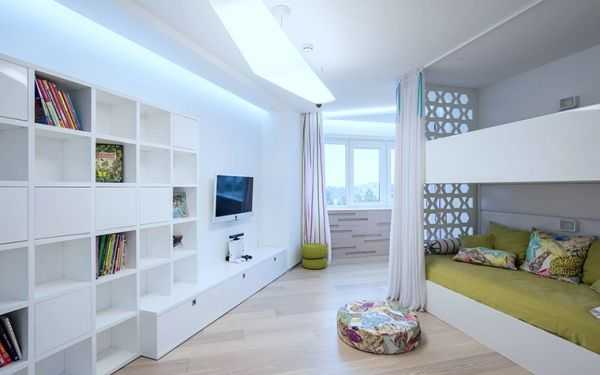 Чем примечателен интерьер на фото-примере? Во-первых, зону для сна можно изолировать с помощью легкой шторки, так что яркие акценты в комнате не повлияют на отдых ребенка. Во-вторых, имеется достаточно места для игр, а планировка продумана с учетом необходимости и отдыха, и чтения, и игр с друзьями.