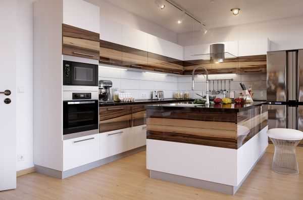 Какая кухонная мебель характерна для современного дизайна? Удачно будет смотреться глянец и светлое дерево. Допустимо выбирать гарнитур со вставками из стекла и встраиваемой техникой.