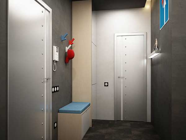 Немного странное впечатление оставляет дорожный знак на стене, а серого цвета зрительно сужают и так неширокую прихожую. Здесь не помешало бы зеркало или более светлый оттенок на стенах.