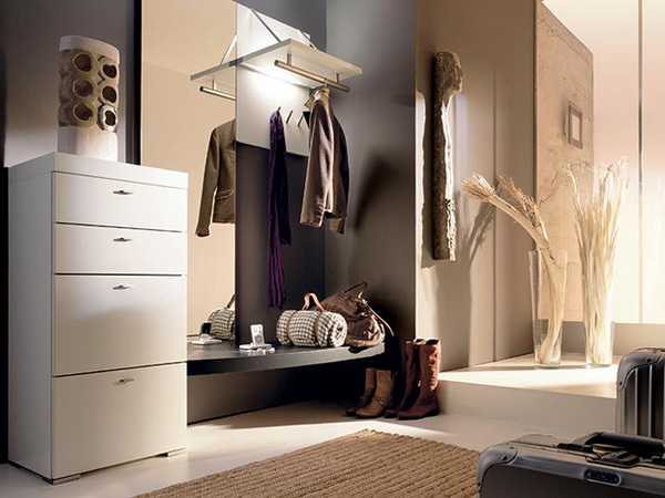 Приветствуется модульная мебель, не занимающая много места и позволяющая совмещать некоторые элементы. Например, пуфик и полка для обуви или подставка для зонтов и закрытый пенал для одежды.