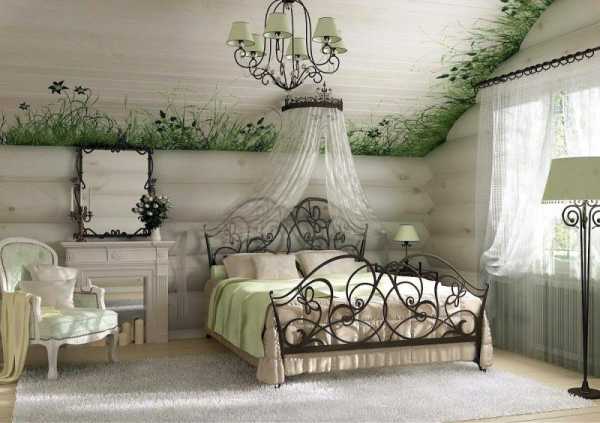 Кроме дерева может быть использована плетенная и кованая мебель. Но совсем не обязательно, чтобы она вся была кованой. В спальне это может быть только кровать, а в гостиной – основа журнального столика.