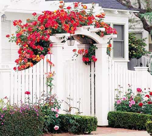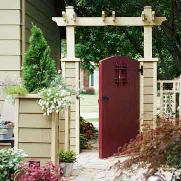 Совершенно изменить внешний вид калитки можно с помощью вьющихся растений, если рядом с ней или на её опорах устроить перголу.