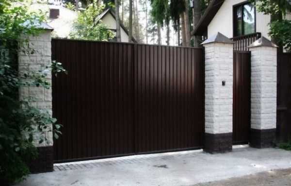 Ворота и калитка из профнастила на кирпичных опорах прекрасно сочетаются с домом