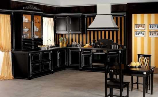 На фото — черная кухня из МДФ: ремонт с темной отделкой и контрастными деталями.- Допустима серая кухня. В этом случае классическая благородная обстановка будет выглядеть более современной. Такое решение применимо в эклектичных вариантах интерьера, подобные оттенки использует дизайн в стиле контемпорари, воплощающий классицизм в современном видении.