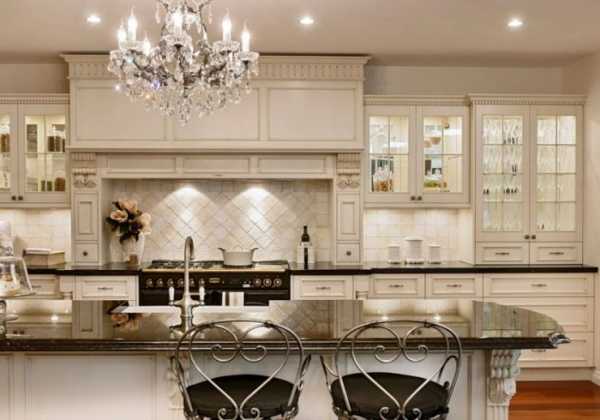 Учитывая, что классический дизайн кухни – это привилегия больших помещений, центральным осветительным прибором в нем служит красивая и объемная люстра. Она может быть выполнена из хрусталя или искусственных кристаллов, украшена бронзовым или золотым покрытием. Главная ее задача состоит в том, чтобы поддержать изначально заявленную роскошь и торжественность стиля.