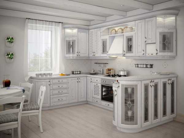 Наиболее популярным решением является белая кухня в классическом стиле. Этот цвет всегда выглядит нарядным, торжественным и чистым. Интерьер становится просторным, а обстановка – величественной. Но дизайн даже гарнитуров из МДФ никогда не бывает однотонным: каждый подобный проект использует отделку в виде позолоты. Как правило, ее наносят на ручки фасадов, на сами фасады в местах фрезеровки, на потолочную лепку, при этом аналогично могут декорироваться вытяжка, буфеты с витриной и другие детали.