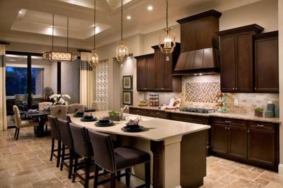 На фото — коричневая прямая кухня: люстры над островом в качестве центра.- Можно выбрать гарнитур с барной стойкой, выполненной в виде острова. Это так называемый полуостровной вариант. Как правило, такое оформление имеют угловые формы мебели. Барной стойкой в этом случае можно пользоваться как островом – вплоть до установки здесь плиты или мойки. Подобные элементы могут служить и обеденной зоной. Тогда подбирают соответствующие стулья: сюда подойдет и современный вариант, обитый кожей. Единственное требование – ножки должны быть выполнены из массива дерева.