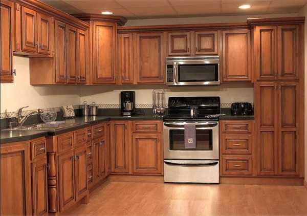 - Базовый материал для кухни — дерево, шпон. Более дешевым вариантом считается МДФ.