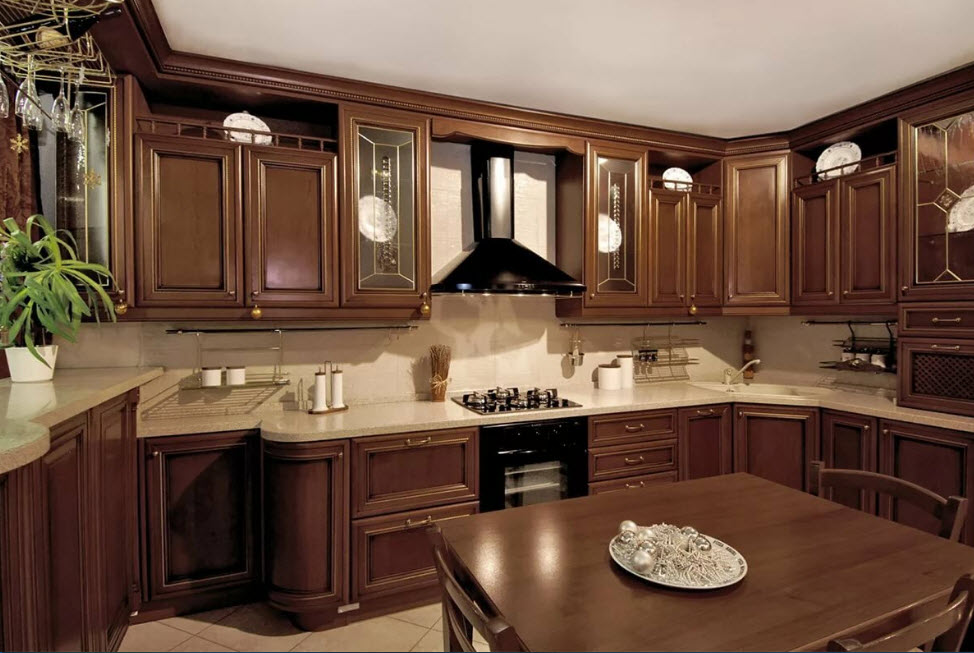 При помощи оттенков коричневой, серой и черной гаммы можно получить добротную, респектабельную кухню в классическом стиле. Подбирая мебель в темных тонах, стоит сделать ставку на игру оттенков и фактур одной цветовой палитры.