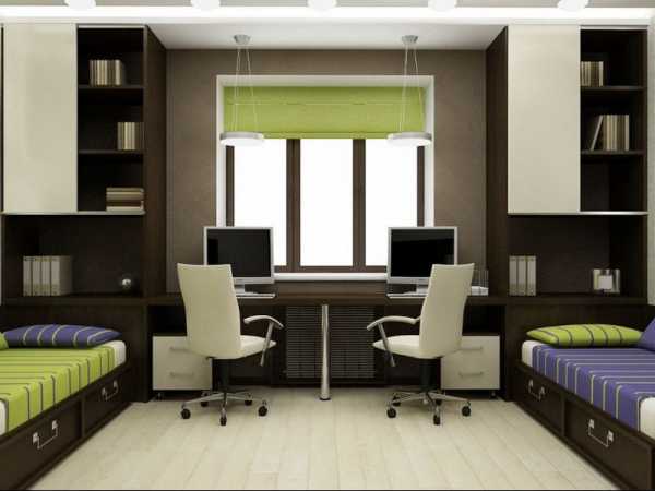 Мальчикам постарше может понадобиться компьютер, а то и два. Две рабочие зоны должны находиться на некотором расстоянии друг от друга. А кровати можно поставить рядом друг с другом, отгородив их по желанию комодом, стеллажом или прикроватной тумбой.