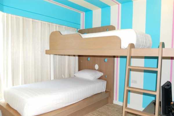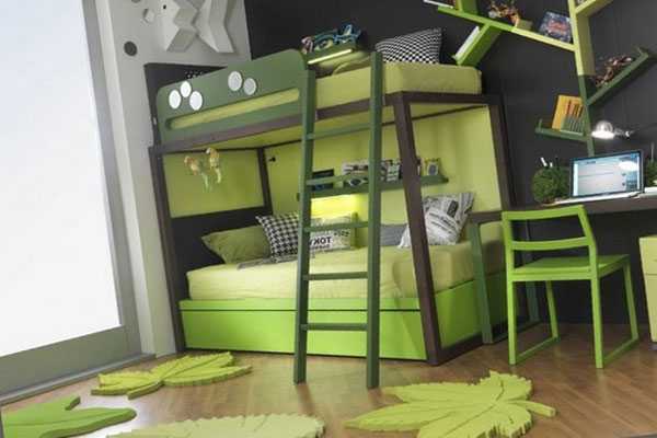 В этом случае днем в помещении появляется комфортная игровая зона, а интерьер детской комнаты для двух мальчиков становится привлекательнее, так как при этом найдется место для небольшого стола, необходимого даже дошкольнику, спортивной стенки, где неугомонные мальчишки будут получать первые спортивные навыки.