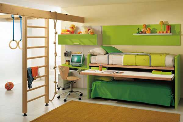 [adsleft] Было бы замечательно, если бы в комнате мальчиков нашлось место для минимального набора спортивных снарядов – стенка и турник либо кольца. Задача сложная, но если подобрать подходящую мебель, то вполне разрешимая, особенно если дети близки по возрасту.