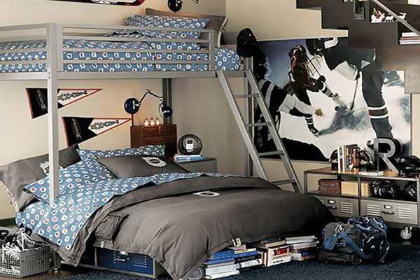 Продуманная система хранения позволит разместить все необходимые мелочи. Желательно предоставить мальчикам отдельную кладовую для хранения двух велосипедов, нескольких сноубордов, пары скейтбордов, двух пар роликов, нескольких гитар, и многого того, что забыли перечислить.