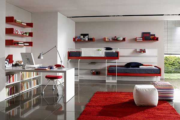 Что же касается спальных мест, то тут тоже выбор зависит от площади, которую можно выделить в комнате. Вариантов множество – от двух отдельных кроватей, расположить которые можно различным образом, учитывая пожелания подростков, до двухъярусной кровати, отлично экономящей площадь комнаты. Следует только позаботиться о том, чтобы размеры спального места соответствовали возрасту ребят.