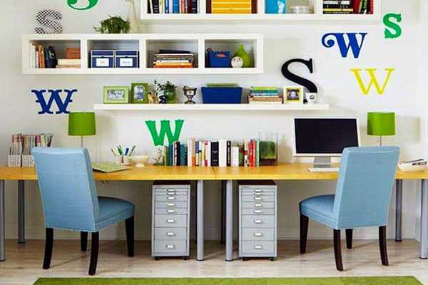 Лучше, если оба стола будут расположены у окна, так как качественное естественное освещение более благоприятно для зрения. Если же такой вариант организации рабочей зоны невозможен из-за размера или планировки помещения, то следует позаботиться об источнике света (настольная лампа) на каждом письменном столе.