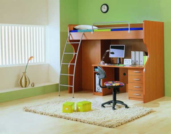 Кстати, сейчас выпускают очень удобные варианты двухъярусных кроватей, где нижняя половина выступает из-под верхнего яруса. Это позволяет хозяину нижнего яруса чувствовать себя более комфортно, а появившееся пространство используется под полочки или небольшой шкафчик. Там отлично размещаются школьные принадлежности.