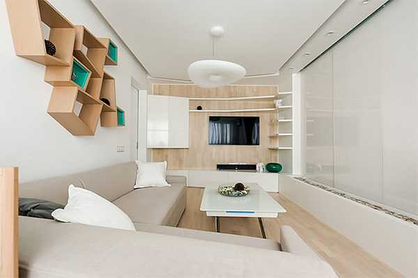 Декорирование стен, пола, потолка лучше выполнить в одном цвете, но в разных оттенках – это зрительно увеличит площадь, создаст эффект объемного помещения. Этот способ делает интерьер уютным, очень современным. Разбавить цветовую палитру можно яркими модульными картинами или иными элементами декора. Выбирая мебель, отдайте предпочтение экономичным не громоздким моделям с многофункциональными опциями.