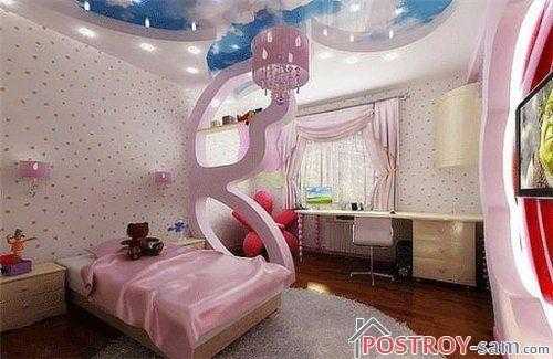 Если потолки в комнате высокие, можно установить натяжные потолки. Это поможет и зонировать помещение, используя полотно разного тона или из разного материала, и скорректирует пространство, и просто украсит девичью комнату.