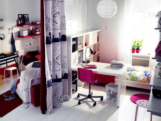 - Зонирование комнаты. Как правило, в комнате выделяются три зоны — для отдыха, учёбы и приёма гостей. Зонирование можно выполнить с помощью мобильных или статичных перегородок из гипсокартона или пазогребневых плит. Интересно выглядит зонирование цветом. Спальная зона отделывается в спокойных оттенках, а гостевая и учебная — в ярких и сочных. Это могут быть версии одного и того же цвета. Зонирование маленьких комнат выполняется с помощью ширм или штор. Особенно симпатично выглядит штора, отделяющая зону сна. Кроме того, для зонирования часто используется мебель — стеллажи и шкафы. Особенное внимание следует уделить рабочей (учебной) зоне. Там обычно размещается стол (компьютерный или письменный) и полочки (шкафчики) для книг. Чаще всего стол ставят у окна, чтобы пользоваться естественным светом. Но и искусственное освещение рабочей зоны должно быть оптимальным. Зонирование можно выполнить и при помощи освещения. В вечернее время лампы служат определителями зон.