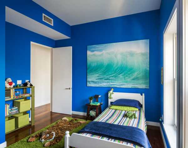 Определившись с общей тематикой комнаты, далее следует перейти к вопросу о цветовой гамме. Как правило, в большинстве случаев детскую комнату для мальчика делают в синих тонах. Это нормально, ведь синий цвет и его оттенки способствуют физическому и моральному расслаблению, а также создают атмосферу безопасности.