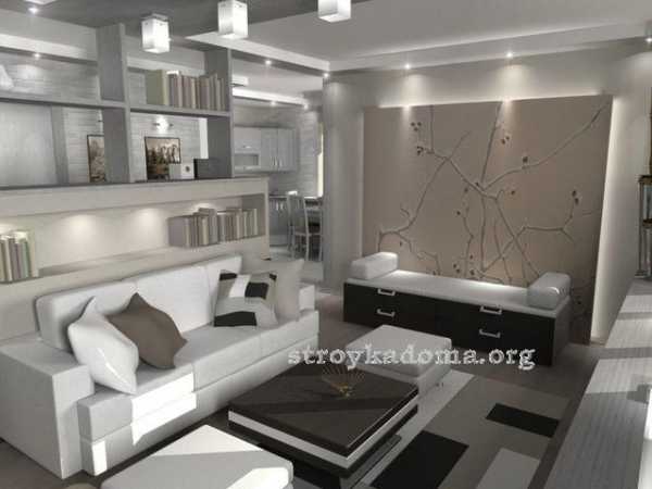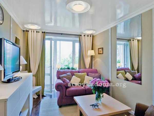Ее основное преимущество – экономия пространства. Площадь расширена за счет объединения комнат, отсутствия явных перегородок. Зонирование можно осуществлять с помощью цвета, занавесей (которые днем можно прятать в ниши), стеллажей для книг (торцы которых оформляются зеркалами).