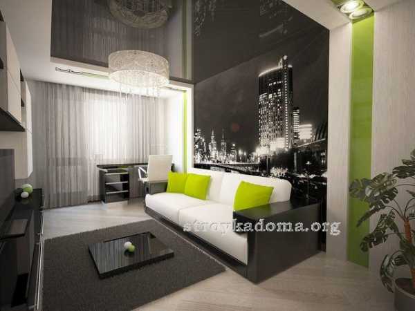 Тоже интересный вариант зонирования. Фотообои подобраны таким образом, что комната кажется глубже. Напротив дивана (на фото этого не видно) стоит телевизор на тумбе. Благодаря этому можно его смотреть с любой точки квартиры.