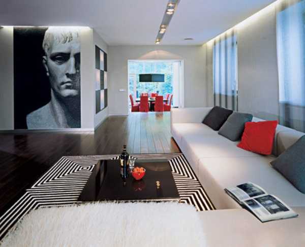 Черно-белые или монохромные фотообои в интерьере зала будут выигрышно смотреться, если прочие элементы декора – яркие.