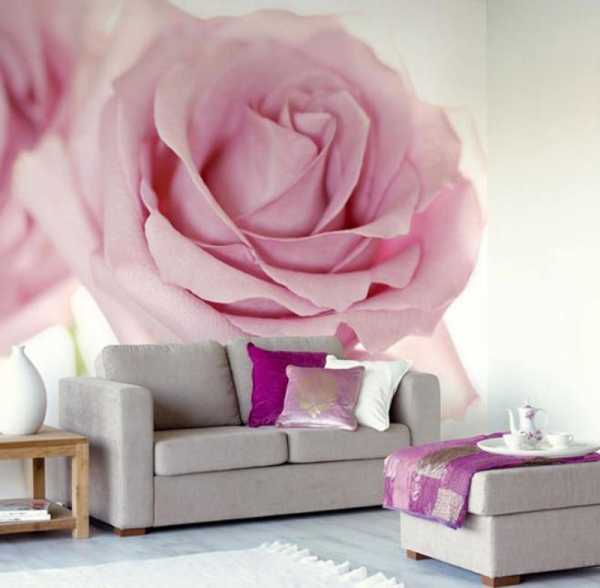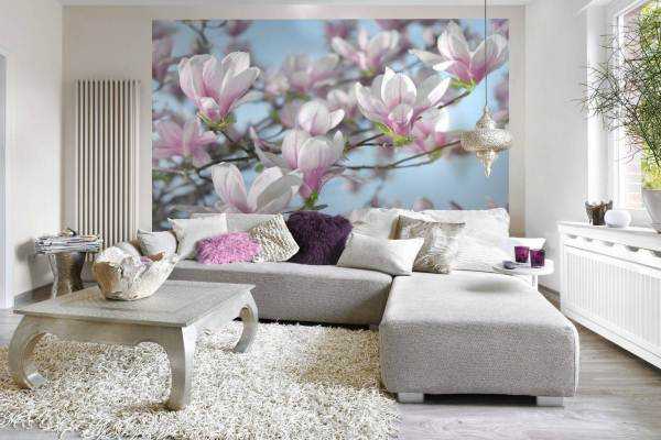 Для интерьеров гостиной с фотообоями отлично подойдет также и цветочная тематика. Подобный сюжет прекрасно впишется в светлый интерьер гостиной, а белые и бежевые тона визуально сделают помещение больше.
