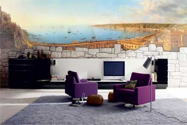 Чаще всего фотообои размещают в зоне отдыха за диваном или возле журнального столика с креслами. Расположившись уютно на мягком диванчике, можно расслабиться и отдохнуть после тяжелого дня, рассматривая пейзажи, помечтать об отдыхе за границей, наслаждаясь достопримечательностями одного из известных курортов или городов.