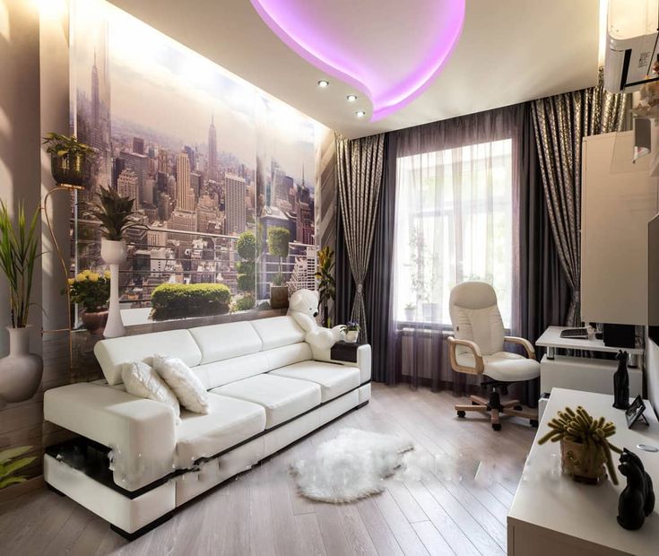 Натяжные потолки до сих пор актуальны, только стоит отказаться от массивных конструкций. Предпочтение стоит отдать матовым пленкам, а также решениям с интересными узорами и рисунками, которые подчеркнут стилистику интерьера.