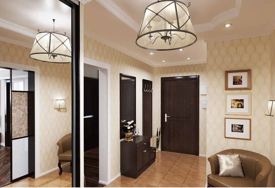 Поскольку прихожая редко оснащена окнами, особое внимание стоит уделить свету. Для маленькой квадратной прихожей может быть достаточно компактной люстры на потолке и нескольких настенных бра хотя бы по бокам от зеркала. Если в коридоре натяжные или навесные потолки, светильники можно встроить прямо в них по периметру помещения. Обилие глянцевых поверхностей и зеркала сделают прихожую ещё светлее. Варианты дизайна квадратного коридора в квартире можно видеть на фото далее.