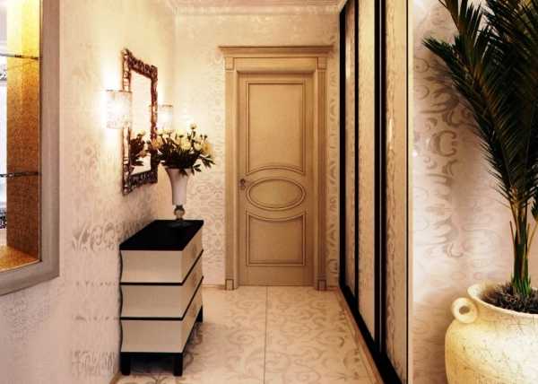 Проблему невыразительного узкого коридора можно решить красивыми обоями с высокодетализированным рисунком, а также большим количеством зеркал, визуально расширяющих пространство.