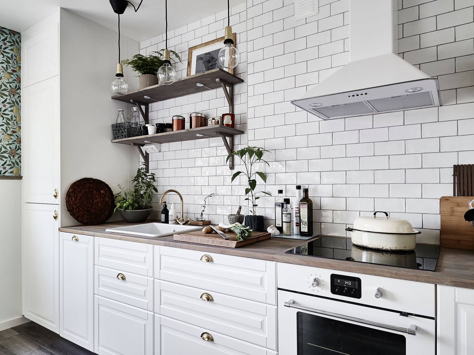 Заказные конструкторы Graystone просмотреть в полном размереСтеллажи, установленные на белой плитке в стиле метро, на белой кухне с фартуком на варочной панели с кирпичным акцентом.