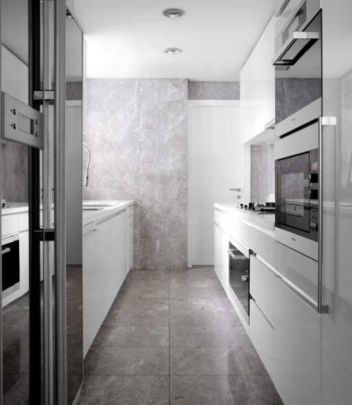 Двустороннее размещение, как видно на фото, приемлемо только в том случае, если вдоль одной маленькой стены установлена мебель для готовки, а другой — для обеденной зоны.