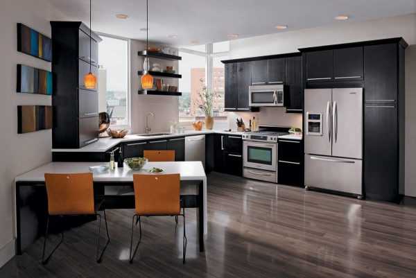 По-прежнему в моде и черные глянцевые кухни для дорогих интерьеров, а также в последнее время набирает обороты отделка кухни под натуральное дерево.
