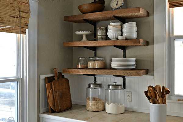 Интерьер может быть самым разнообразным – он подбирается в соответствии с площадью помещения и вкусами хозяев. Угловая кухня бывает настолько вместительной, что удается отказаться даже от навесных шкафов. Их заменяют выдвижными каруселями и открытыми полками, специальными цоколями в тубе для выкатных ящиков.