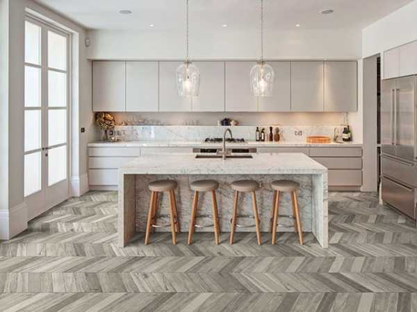 В 2019 году большое значение для интерьера кухни имеет то, какой материал вы используете для пола. Если раньше на полу кухни практически всегда использовалась плитка или керамогранит, то сейчас на рынке продается, к примеру, ламинат повышенной стойкости к разрушению, который можно с легкостью использовать и не расстраиваться, если что-то на него упадет. Да и среди плитки прибавилось рисунков — начиная от керамогранита с дубовым узором, заканчивая полноценной мозаикой для пола.