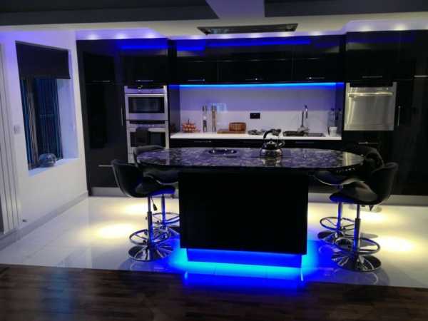 1. Если кухня выполнена в темных тонах, то желательно сделать не только точечное освещение рабочих участков, но и полное, которое обеспечит комфорт для всех присутствующих. Важно помнить, что на 1 кв метр положено 20 -30 Вт.