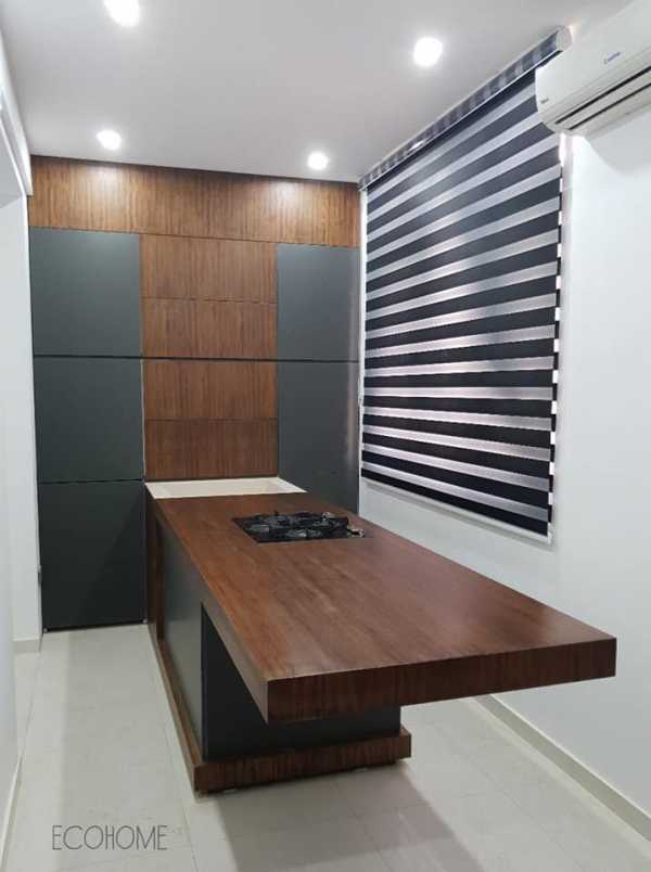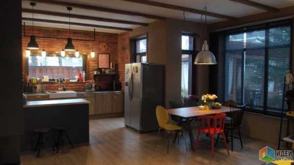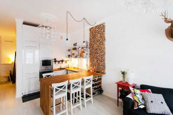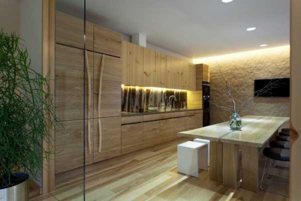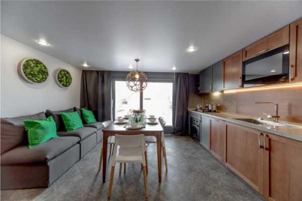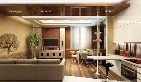 Дизайн кухни-гостиной в стиле эко на 15 кв.м.- Откажитесь от пластика в отделке и составе мебели. Имитации – не всегда удачное решение, они все равно выдадут себя.