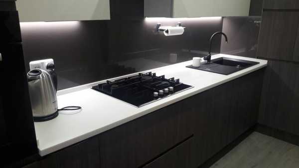 - Расширяет пространство светодиодная подсветка внутренности шкафов со стеклянными дверками или отдельных навесных полок с эксклюзивной посудой. Все чаще основной акцент направляется на фартук из прочного стекла с интересным дизайном и оригинальной подсветкой.