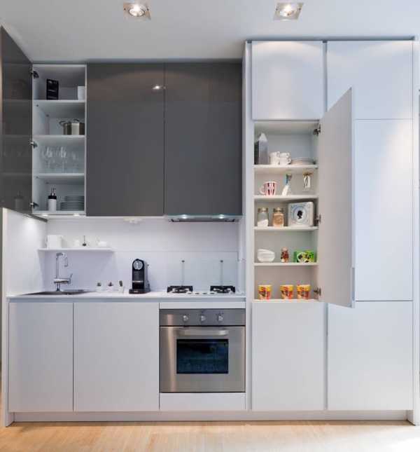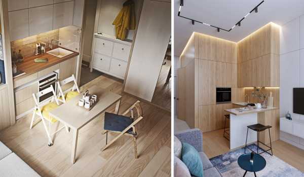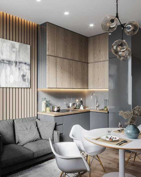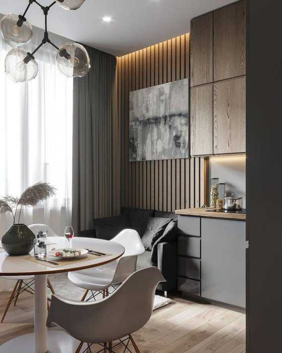 Кухонный гарнитур является не просто функциональной зоной приготовления еды, а частью интерьера. Замаскированная под шкаф или спрятанная за перегородкой кухня визуально освобождает больше места для гостиной.