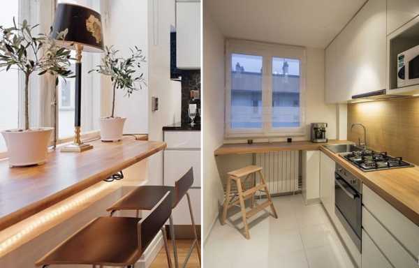 Все чаще роль барной стойки исполняет подоконник, который облицовывают прочным материалом и при необходимости делают более широким. Таким образом дизайн маленькой кухни 2019 становится более привлекательным и удобным.