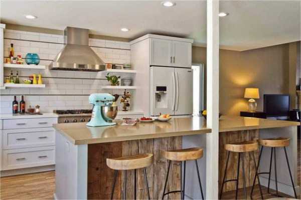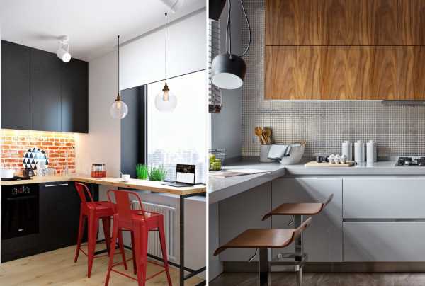 Установка барной стойки — оптимальный выбор для узкой кухни, где для обеденного стола не остается места. В такой ситуации небольшую барную стойку оборудуют у стены с окном, для удобства можно сделать ее откидной.