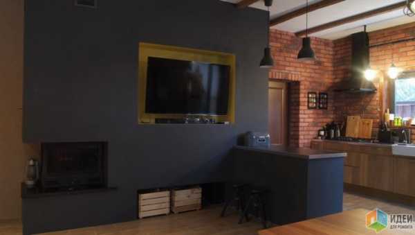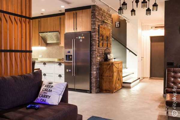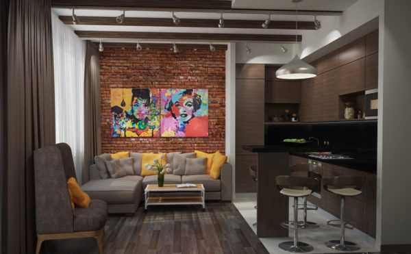 Если выбран современный дизайн кухни гостиной 2019, то в тренде создание в одном из углов этого помещения конструкции в виде ларька для продажи фаст-фуда. Благодаря этому приему у вас появится отдельная маленькая кухня, которая, в то же время, будет частью основного помещения.